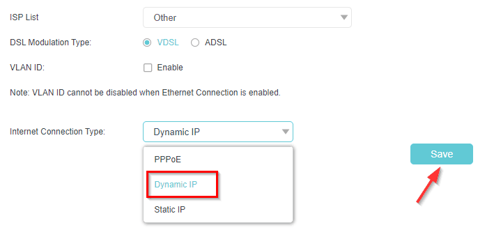 Select the DSL Modulation Type as “VDSL” (Do not enable VLAN ID)